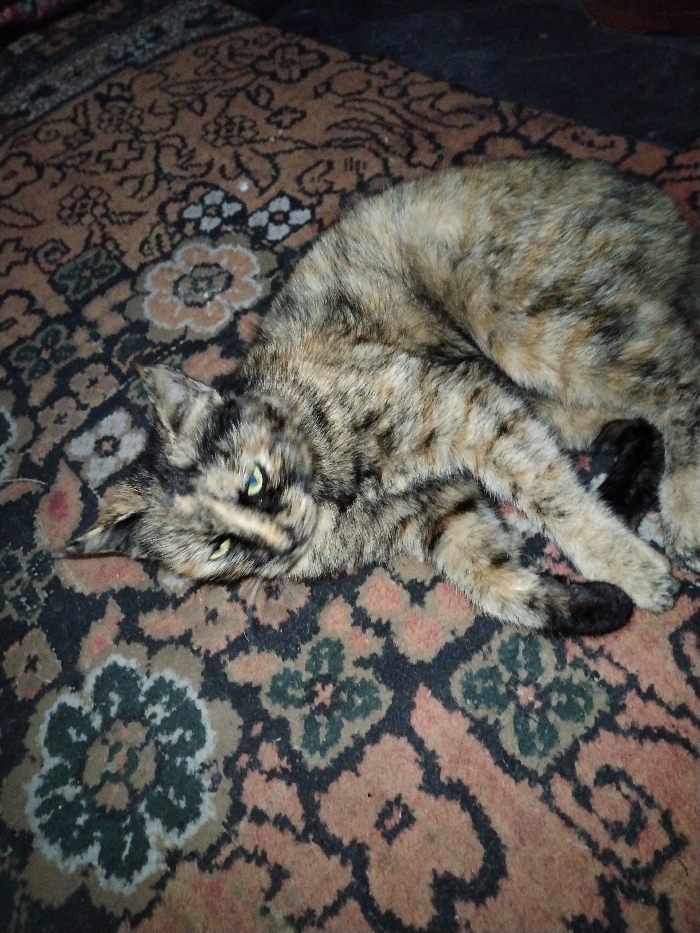 A tortoiseshell cat lies on a patterned rug. The cat's fur is a mix of brown, black, and tan. It is lying on its side with its front paws stretched out. The cat's eyes are partially open, and it appears relaxed. The rug has an intricate floral pattern in shades of brown, green, black, and pink. The lighting is somewhat dim, creating a cozy and comfortable atmosphere.