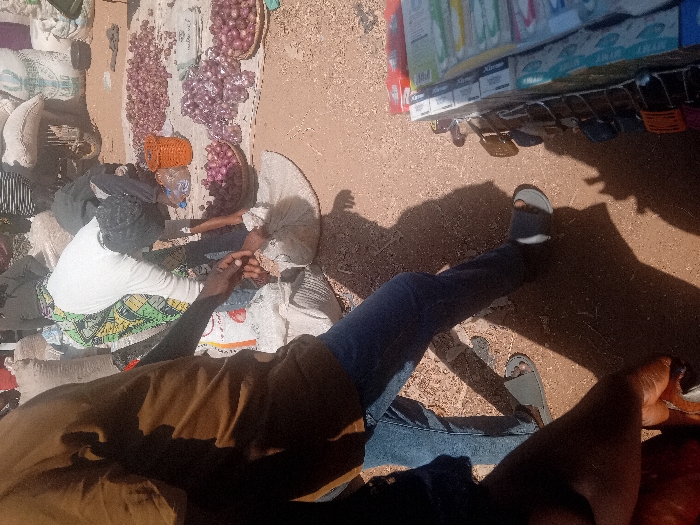 The scene depicts an outdoor market in Gurku Gwari, Nigeria, under bright sunlight, casting prominent shadows