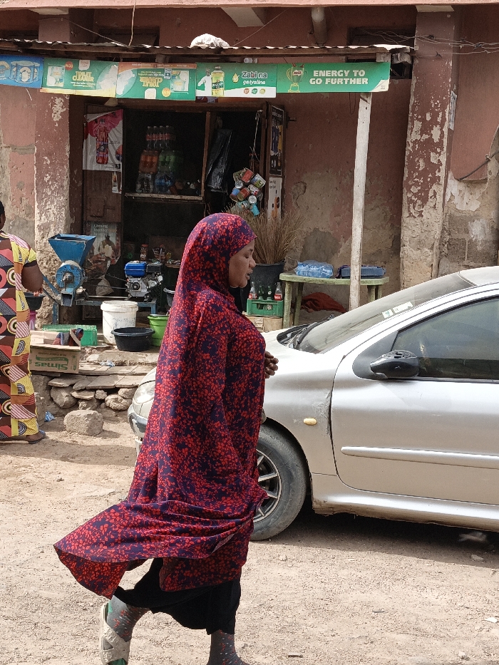 The image depicts a street scene in Gwagwarwa, Nigeria, featuring two individuals, a commercial establishment, and a vehicle. In the foreground, a woman walks from left to right across an unpaved, dusty ground. She is clad in a long, flowing garment patterned with red and purple floral or abstract designs, which covers her head and body. Visible beneath her garment are black trousers and grey sandals worn over patterned socks. Her hands are held in front of her, and her face is seen in profile, looking slightly downward. The fabric of her garment billows behind her left leg, indicating motion. To the far left, partially visible, is another individual wearing a brightly colored garment with yellow, orange, black, and white geometric patterns. This person stands near a blue and white grinding machine. Adjacent to this machine are a white bucket, a green bucket, and a small engine, colored blue and black. The background features a reddish-brown, single-story building exhibiting signs of wear, including peeling paint and exposed plaster. This building houses a commercial stall or shop with an open entrance. Inside, shelves display various bottled beverages. Above the entrance, a horizontal banner advertises products such as "Zibian" and "Malt," with text including "ENERGY TO GO FURTHER." To the right of the shop entrance, a light-colored plastic table holds multiple bottles of water, a blue object, and bundles of dried grass or straw. The building's wall to the right shows significant deterioration, and a vertical, light-colored support beam is present. A silver-colored car, consistent with a Peugeot 206 model, occupies the right side of the frame, partially obscured by the foreground woman. The vehicle appears dusty, and its driver's side mirror housing is black, possibly damaged. A slight scuff or dent is visible on the front fender above the wheel well. The ground is consistently unpaved and dusty throughout the visible area.