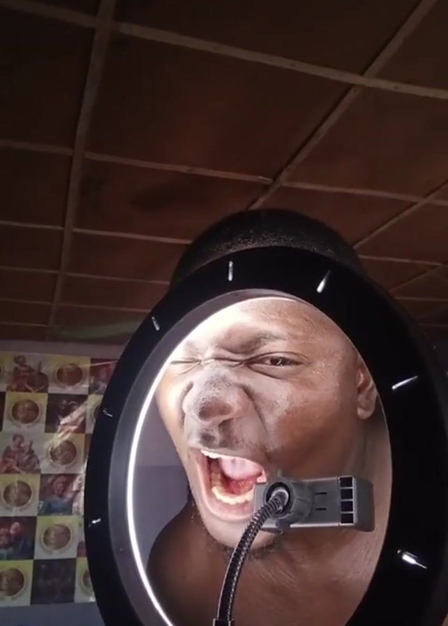 A close-up shot shows a man with dark skin positioned behind a ring light. His face is directly facing the camera with his mouth open as if screaming, and one eye is squinting. The ring light is black, and its light shines directly on the man's face. A microphone is attached to the ring light in front of his mouth. Behind him is a wall covered with small pictures and a blue plastic chair. The ceiling is made of wooden planks. The camera angle is low, looking up at the man.