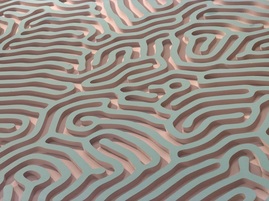 An abstract pattern composed of meandering, parallel light blue lines on a pale pink background. The lines create a labyrinthine network, evoking a maze or a topographical map. The lines appear raised, casting shadows that accentuate the dimensional nature of the pattern. The overall texture suggests a three-dimensional object, perhaps a carving or a molded surface. The perspective creates a sense of depth and complexity.