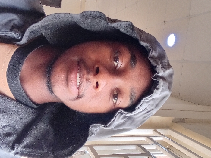 A close-up, frontal portrait depicts a male subject of African descent, centered within the frame. He is wearing a dark grey or black hooded sweatshirt, with the hood pulled up around his head. A light brown shirt with a dark collar is visible beneath the hooded garment. The subject has dark eyes, short dark hair, and a thin goatee extending along his jawline and a mustache. His expression is neutral to slightly smiling, with his mouth slightly open, revealing some upper teeth. The background indicates an indoor environment. To the subject's left, a light-colored wall is visible, with a dark, vertical element partially present in the lower left corner. To the subject's right, a window with horizontal and vertical metal bars (grille) is visible. Above, the ceiling is composed of light-colored grid panels, and a single, round, illuminated white LED light fixture is embedded in the ceiling. The visual information within the image does not provide specific details to confirm the location as Kwazailewa, Nigeria.