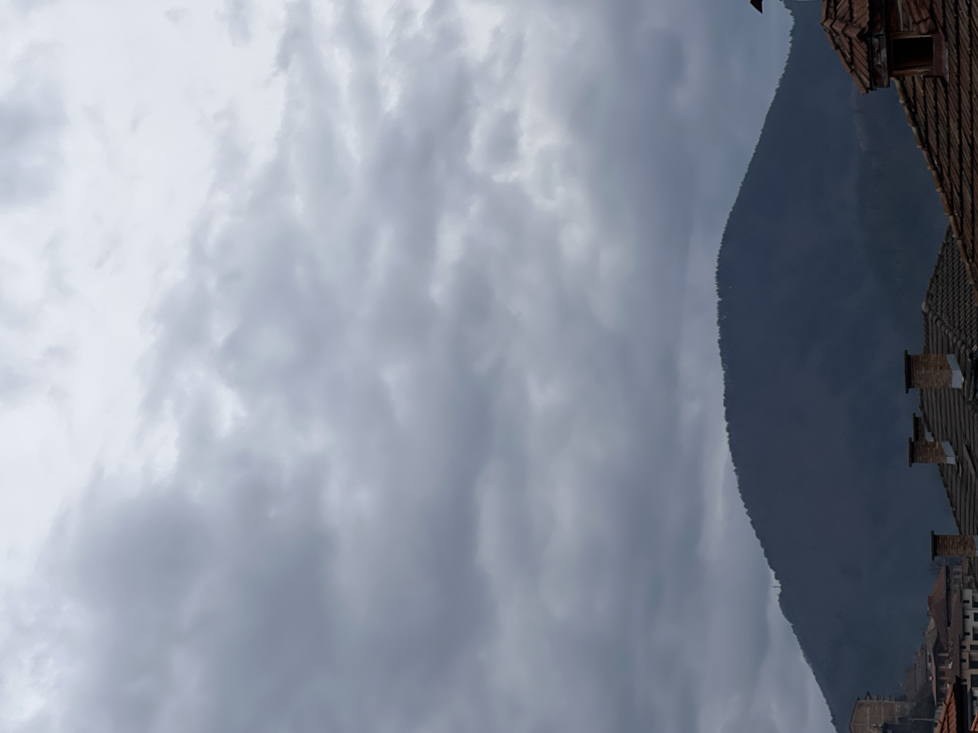 The image depicts a cloudy sky over Smolyan, Bulgaria. In the right half of the frame, the ridgeline of a dark, forested mountain is visible. Portions of buildings, including brown tiled roofs, chimneys, and facades, are partially visible along the bottom right of the image. The sky occupies the majority of the frame, filled with gray clouds.