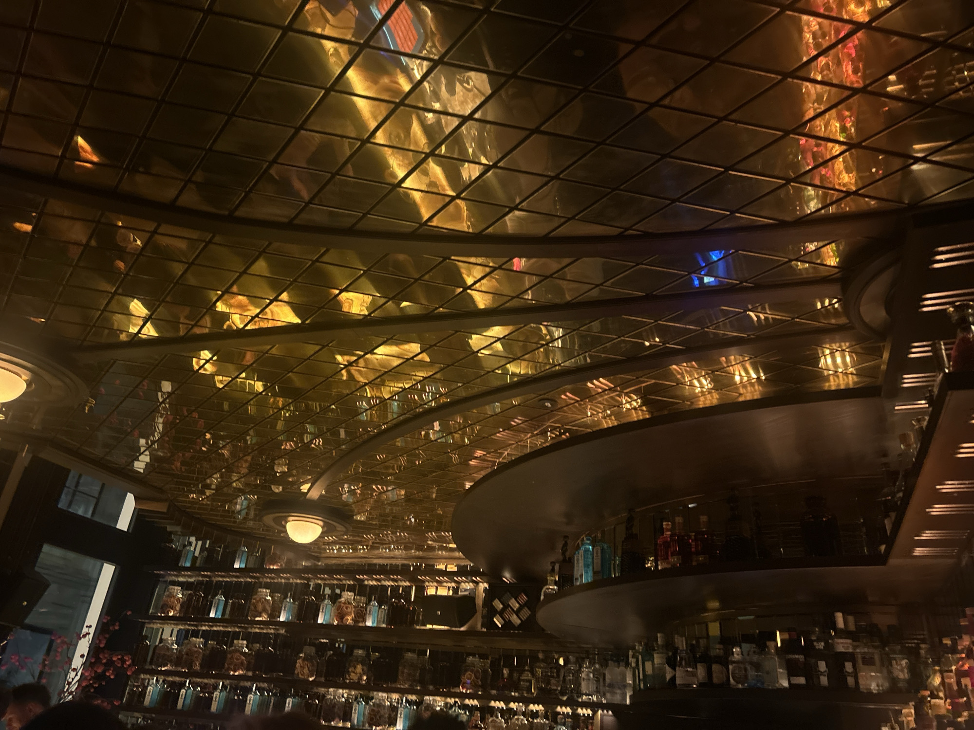 The image displays the interior of The Bank Brasserie & Bar, situated at Am Hof 2, 1010 Vienna, Austria. The scene is characterized by a prominent, vaulted, multi-level ceiling constructed from a grid of small, reflective, gold-toned square panels, which distort and mirror the bar's internal lighting and hues, including flashes of red and blue. In the mid-ground and right half of the frame, a dark, multi-tiered bar or shelving unit is visible. This structure features curved shelves meticulously arranged with numerous bottles of spirits, varying in size, shape, and liquid color (clear, blue, amber). Below one of the bar tiers, a rack holds inverted clear drinking glasses. Multiple spherical, opaque light fixtures, emitting a warm glow, are mounted on the ceiling and potentially within the bar structure. On the far left, a tall, dark-framed window or doorway offers a blurred view of an exterior architectural element. Below this opening, a decorative arrangement of dark branches adorned with small, reddish-pink flowers is partially visible. Indistinct human figures are present, discernible as blurred forms in the foreground and as distorted reflections within the ceiling panels, suggesting patrons and staff. The lighting is predominantly dim and warm, contributing to a luxurious, atmospheric environment.