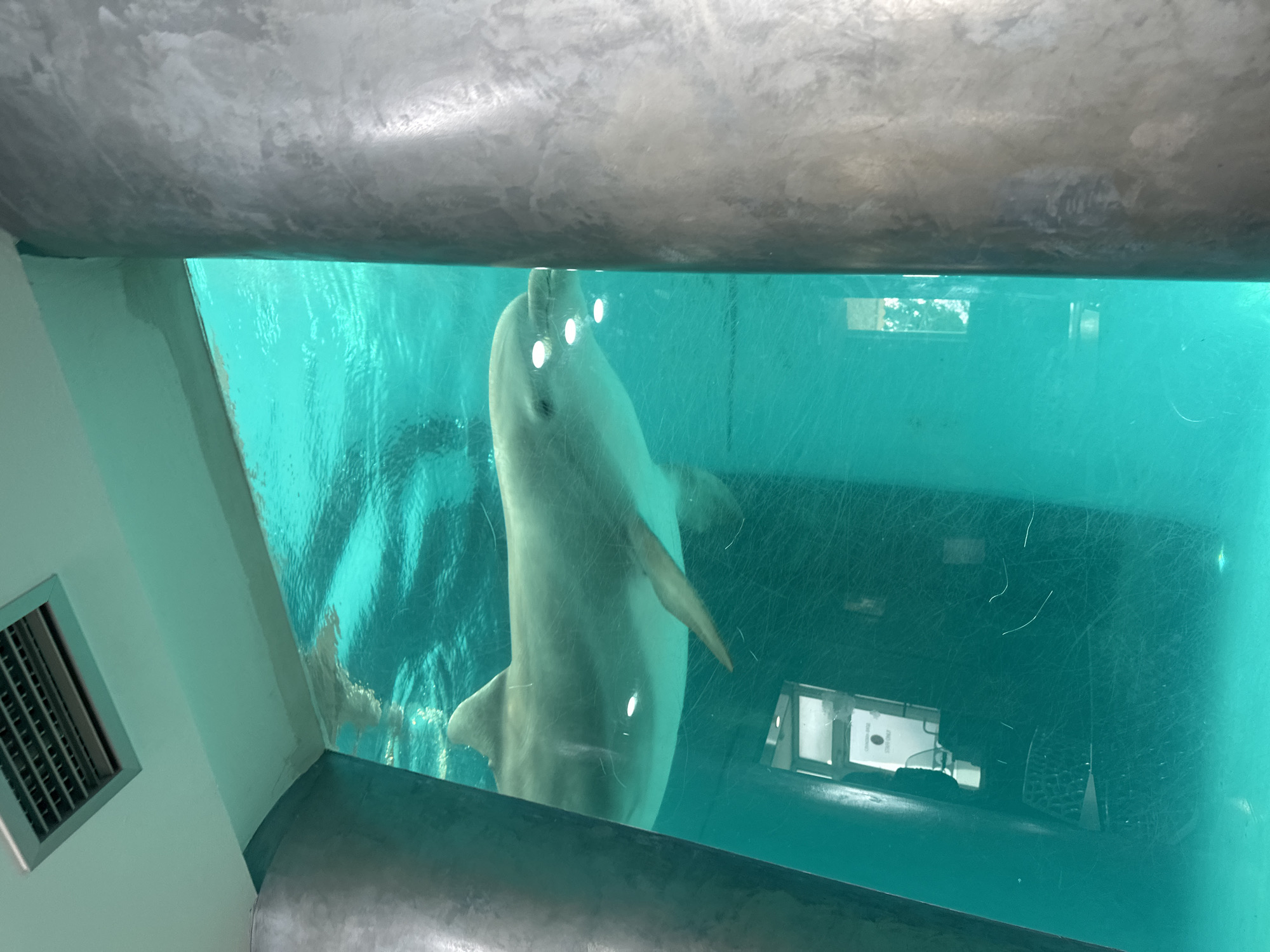 The image depicts an underwater view through a transparent panel at the Varna Dolphinarium in Varna, Bulgaria. The central subject is a single light grey bottlenose dolphin (Tursiops truncatus), positioned horizontally in the upper-middle of the frame, facing towards the right. Its head, dorsal fin, and a pectoral fin are clearly visible through the clear, turquoise-blue water of the tank. Multiple bright white reflections, consistent with artificial overhead lighting, are prominent on the dolphin's head and snout. The viewing area is framed by two large, rounded columns with a grey, textured finish, appearing as brushed concrete or metal; the left column is partially visible, while the right column occupies the far right side of the image. Above the tank, a white ceiling with a rectangular metal ventilation grate is present in the upper-left corner. Through the water and the transparent panel, faint reflections and details of an internal architectural space are visible in the lower-left, including what appears to be a doorway or frame with partially obscured text that suggests a "STAFF ONLY" sign. The transparent panel exhibits numerous fine linear scratches and minor surface particulates. No human figures or direct interactions are visible in the scene.