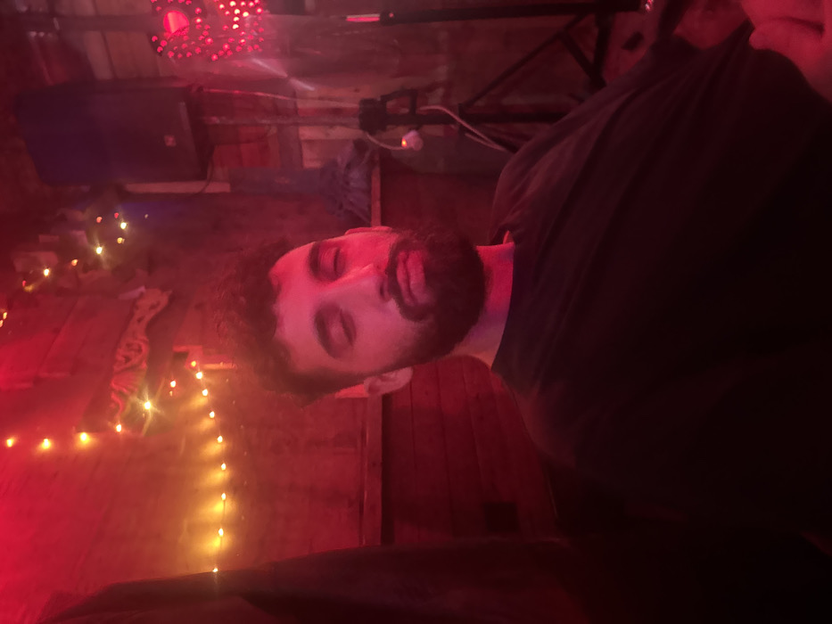 A man with dark hair and a beard is bathed in red lighting, his eyes closed. The scene appears to be indoors, perhaps a bar or club, judging by the lights and a speaker in the background. String lights add to the ambiance. He's wearing a dark t-shirt, and the overall mood is dimly lit and evocative.