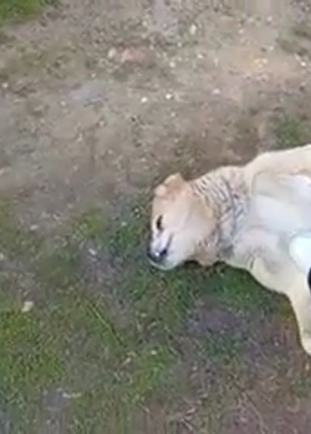 - "dog on its back on a patch of grass and dirt" by FM-M09Ti2, licensed under CC BY 4.0
