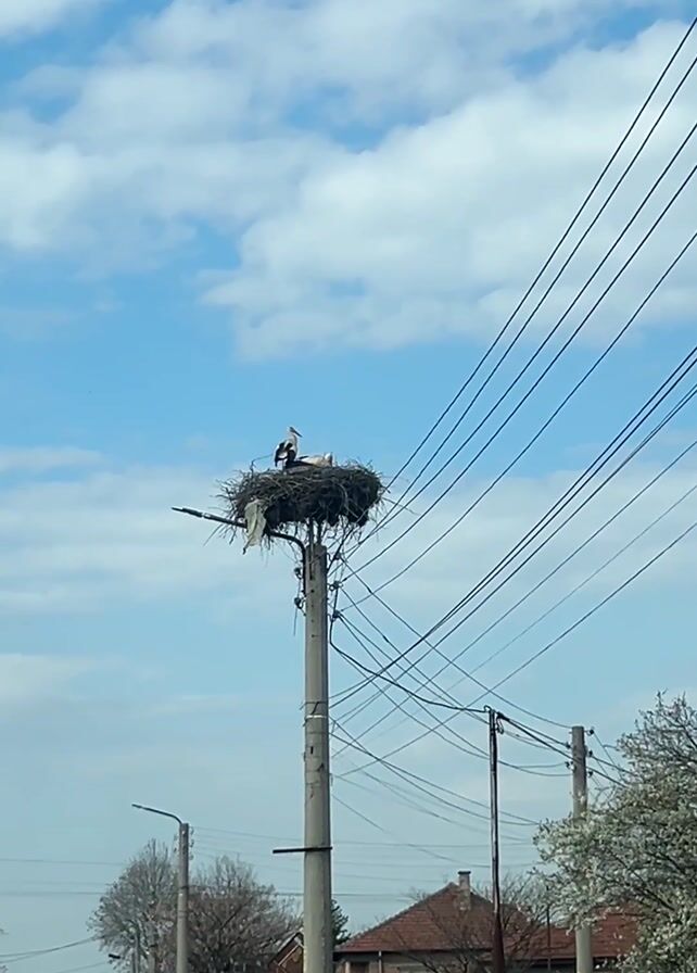 stork standing in a large nest built atop a concrete utility pole. Numerous electrical wires are strung around and above the nest. In the background, a street with houses and vehicles can be seen under a partly cloudy sky.