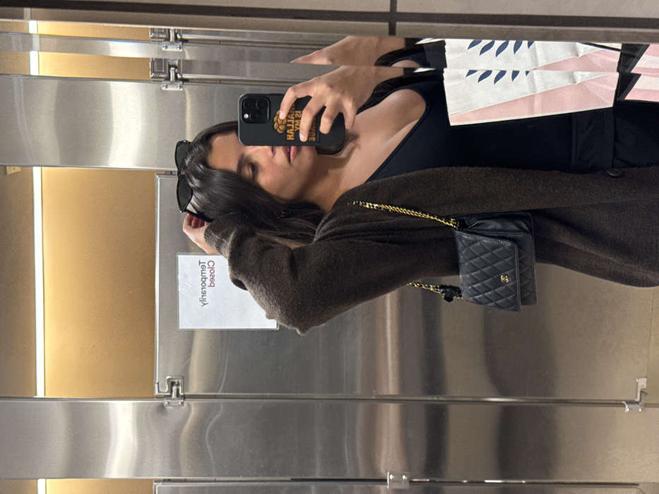 A female subject is captured in a mirror selfie inside what appears to be a public restroom in Lawrence Township, United States. She is seen from the waist up, holding a dark-colored smartphone with a black case and a yellow/orange logo (partially reading "MALLAH IS MY PLACE" in reverse) in her right hand, pointed towards the mirror. Her left hand is raised to her head, near dark sunglasses perched on her dark hair. She wears a dark, low-cut top under a dark brown, textured knit cardigan. A black quilted Chanel handbag with a gold chain strap is visible on her left side. To her right, several multi-colored shopping bags are reflected. The background consists of stainless steel stall doors, one of which displays a reversed white sign reading "TEMPORARILY CLOSED." Above the stalls, a light brown wall section with warm lighting is visible.