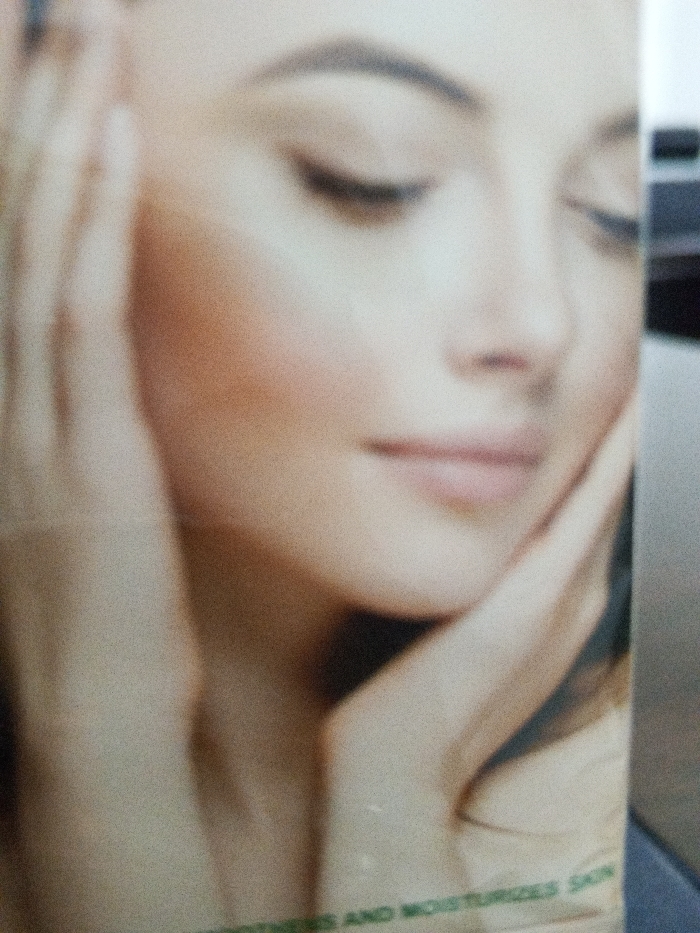 The image displays a blurry and grainy photograph of a printed advertisement, observed in Lokoja, Nigeria. The advertisement prominently features a light-skinned woman's face in close-up, with her eyes gently closed. Her hands are positioned on both sides of her face, with fingers extending upwards along her cheeks. Visible features include dark, well-defined eyebrows, a distinct nose, and slightly parted lips. Green text is partially visible at the bottom of the advertisement, reading "SMOOTHENS AND MOISTURIZES SKIN."