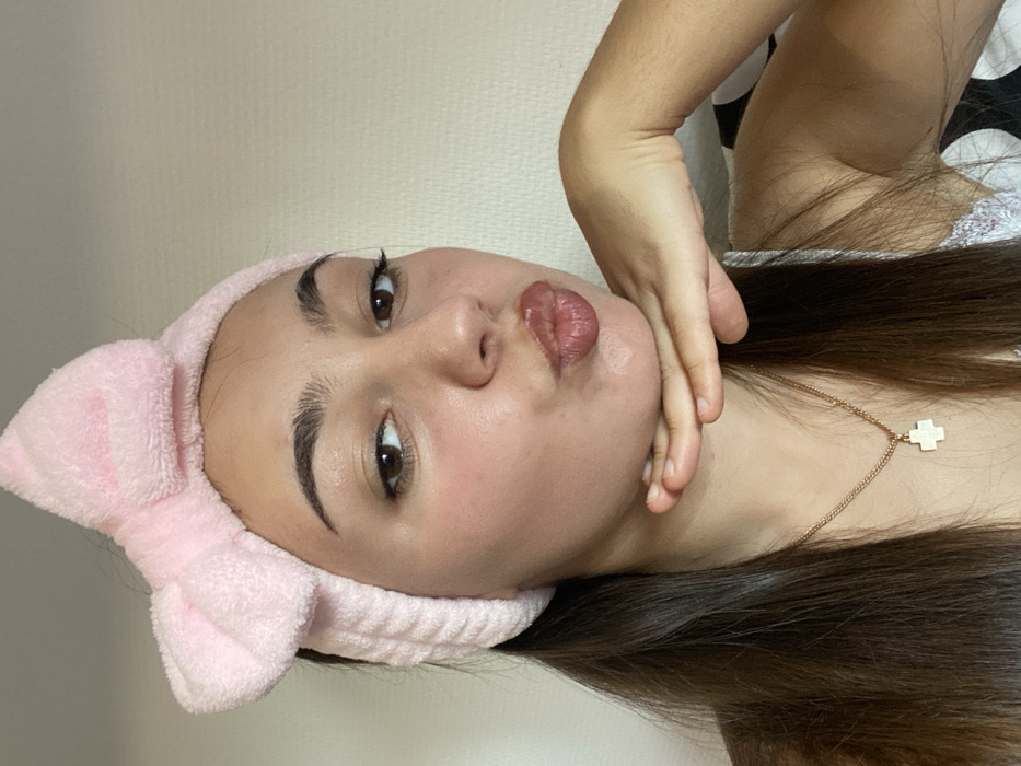 A single female subject is depicted in a close-up portrait. She has long, dark hair, dark eyebrows, and brown eyes, looking directly at the viewer. A pink, textured headband with a large bow positioned centrally is worn on her head. Her lips are pursed into a 'kissing' or 'pouting' expression, and her right hand is positioned beneath her chin, with fingers splayed, seemingly supporting her face. A thin gold-colored chain necklace with a small, flat, rectangular cross pendant is visible around her neck. A light-colored garment with a lace-trimmed strap is partially visible on the lower right. The background consists of a plain, light-colored, textured wall. The image provides no discernible features or contextual information to determine its specific location within the city of Bouxwiller, France.