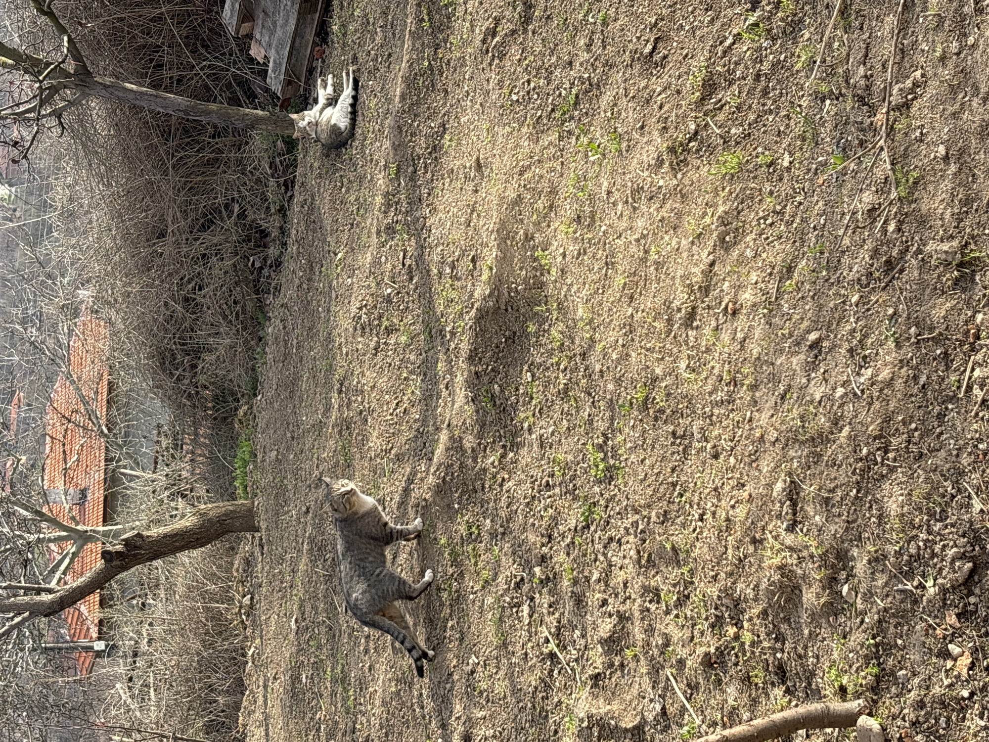 The scene is set in an outdoor, uncultivated plot in Slavyanovo, Bulgaria, under bright natural sunlight. Two domestic cats (Felis catus) are present on a textured, earthy ground sparsely covered with small green sprouts. In the midground, a grey tabby cat stands with its body angled slightly right, head turned towards the viewer, exhibiting alert posture with white paws and muzzle. Its tail is moderately raised. In the upper right quadrant, a second grey tabby cat lies on its left side, relaxed, with its head slightly lifted and looking towards the viewer. This cat is positioned at the base of a bare deciduous tree. Behind the subjects, a dense mass of dry, tangled, leafless brush forms a visual barrier. In the upper left background, partially obscured by bare tree branches and brush, a building with a red-tiled roof and a visible chimney is present. To the right of the reclining cat, stacked wooden elements, possibly pallets, are visible near the tree. Shadows are distinct on the ground and subjects, consistent with direct sunlight.