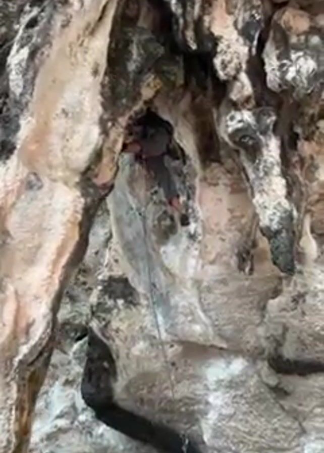 A person is rock climbing within a shallow cave or alcove in a rock formation. The person is wearing dark clothing, including pants and a backpack, and is secured with a climbing rope. The rock formation is light in color with dark markings and crevices. The climber is positioned about midway up the rock face, using both hands and feet to grip the rock. The camera angle is from below, looking up at the climber and the rock formation.