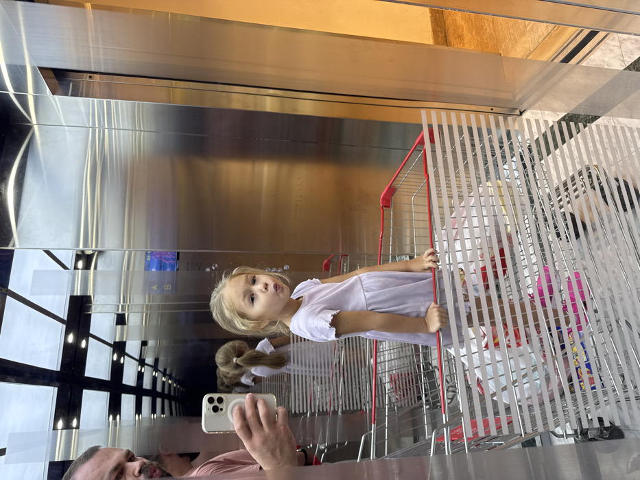 The image captures a scene inside a modern elevator with reflective metallic walls, likely within a commercial or residential building in Dubai, United Arab Emirates. A young blonde-haired girl, wearing a light purple short-sleeved dress, stands within a metal shopping cart with red trim, facing the camera with a puckered facial expression. Her hands rest on the cart's top bar. The cart contains multiple plastic shopping bags filled with various items. Reflected in the mirrored left wall of the elevator, a partial view of an adult male with a beard and a light-colored t-shirt is visible; he holds a white smartphone with a circular grip, positioned to take the photograph. The elevator's control panel, showing illuminated buttons and a digital display (partially legible as "01:11"), is reflected on the right wall. The elevator door is slightly open on the right, revealing a glimpse of an interior hallway with a warm-toned wall and patterned marble flooring. A clear partition with horizontal frosted stripes spans the foreground, partially obscuring the lower sections of the shopping carts and the floor. The elevator ceiling features square recessed lighting.