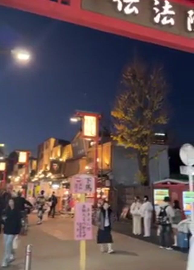 night view of a crowded street in Japan. People are walking under a large red gate with Japanese characters on it, which is lit up. The sky is a deep blue. There are streetlights and lanterns illuminating the area. On the sides of the street, there are stalls and shops. Some people are wearing traditional Japanese clothing. The overall atmosphere is lively and festive.