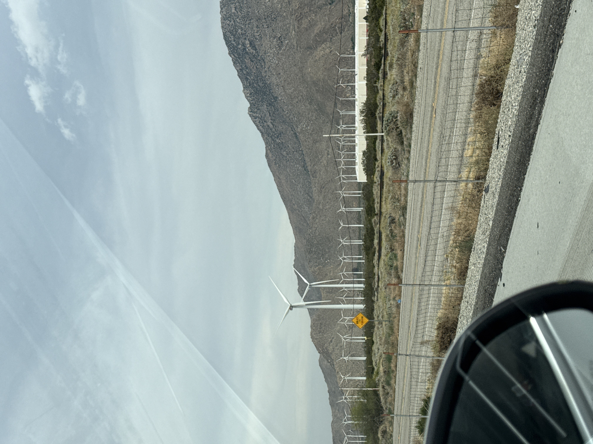 The image captures a view of a wind farm in Cabazon, United States, seen from inside a vehicle. A mountain range forms a backdrop to numerous white wind turbines lined up along the landscape. A road runs parallel to the wind turbines, separated by a wire fence. A yellow sign is visible next to the road. The sky is overcast with streaks of light clouds. A portion of the car's side mirror is visible in the lower right corner of the image.