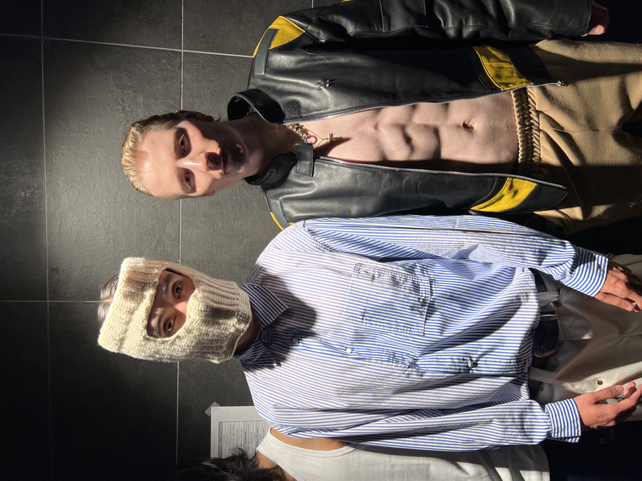 The image displays three individuals in an indoor setting, located in Paris, France. The background consists of a dark, horizontally paneled or tiled wall, with a piece of white paper taped to it on the left side. Strong, directional lighting illuminates the subjects from the front, casting shadows and highlighting textures. On the far left, a person is partially visible, showing only the left side of their torso, dressed in a plain white tank top. The central figure, appearing male, wears a light beige, ribbed knit balaclava covering the head and face, with an opening revealing dark eyes and eyebrows. This individual is clad in an oversized, long-sleeved button-up shirt with thin blue and white vertical stripes, tucked into light-colored trousers secured by a dark belt. Both hands are visible at the person's sides. The individual on the right, appearing male, has slicked-back blonde hair and a slightly pursed facial expression. This person wears an open black leather jacket featuring yellow accent panels on the shoulders and lower front, revealing a bare, muscular chest and abdomen. A prominent silver-colored chain necklace with a small cross pendant hangs around the neck. Light brown athletic-style trousers with an elastic waistband complete the attire. All subjects are standing upright, facing the viewer, seemingly posing for the photograph.