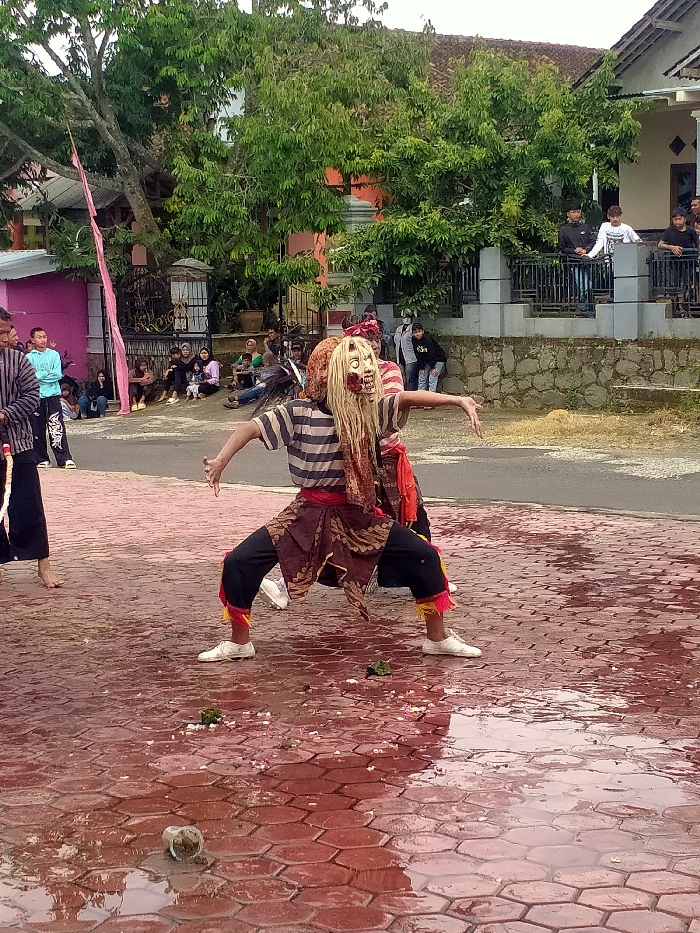 A performer wearing a grotesque mask and a horizontally striped shirt, accessorized with a red sash and a patterned brown cloth, performs a traditional dance. Another performer stands behind him. A crowd watches from various locations, including behind a fence and along the side of a pink building. The wet, brick-paved ground reflects the surroundings. A couple of scattered items lie on the ground. Lush green trees frame the backdrop.