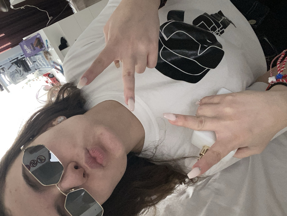 A female subject is depicted in a selfie taken indoors, likely in a private residence within the city of Silistra, Bulgaria, though specific identifiers for the precise location are absent. She wears large, hexagonal, gold-framed sunglasses with dark, reflective lenses, obscuring her eyes. Her lips are pursed in a pout. A stud earring is visible in her right ear. Her dark hair is draped over her left shoulder. She is wearing a white long-sleeved t-shirt with a prominent black graphic design on the chest, depicting two stylized fists. Her fingernails are long, almond-shaped, and painted a light, translucent pink or nude color, with a faint glitter detail at the base. Her right hand is raised, forming a "V" sign (peace sign) with the index and middle fingers extended. Her left hand holds a small, white, rectangular object with a gold-colored applicator tip, possibly a bottle or device. A red and white braided bracelet, consistent with a Martenitsa, is worn on her left wrist. The background reveals a white desk or surface on which a desktop computer tower with a transparent side panel and visible internal fans is placed. Adjacent to the computer, a purple package labeled "Milka brownie" and a red toy car are visible. A dark curtain or drape is partially discernible on the far right.