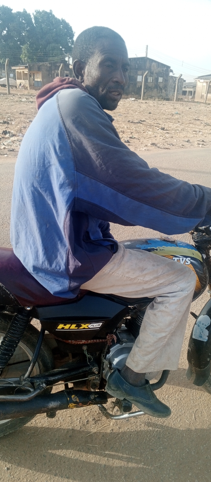 A male individual with dark skin, short dark hair, and a short beard is depicted seated on a black motorcycle in an outdoor setting in Tunga Mekidi, Nigeria