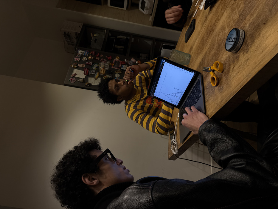 The scene depicts an indoor gathering in Saint-Denis, France, centered around a wooden table. Two males are prominently featured, with a third person partially visible. On the left, a male with dark, curly hair and dark-rimmed glasses is seated, wearing a black jacket (likely leather). He is actively engaged with a silver-colored laptop, his right hand positioned over the keyboard/trackpad. The laptop screen displays a financial candlestick chart. Next to the laptop, a white charging cable is coiled, and a black smartphone lies face down. To the right, a second male with dark, curly hair and a yellow and dark striped shirt is seated, holding a black and red vaping device to his mouth. He is looking towards the laptop screen. A textured clear glass, partially filled with liquid, sits near him. On the table in the foreground, yellow-handled scissors and a blue and white cylindrical container labeled "VELO" are present. Towards the far right, a hand is visible, and several cigarettes are on the table or in an adjacent receptacle. The background shows a domestic environment, including a refrigerator adorned with numerous magnets and notes, and a shelving unit with various kitchen appliances, indicating a kitchen or dining area. The lighting is warm and somewhat dim.