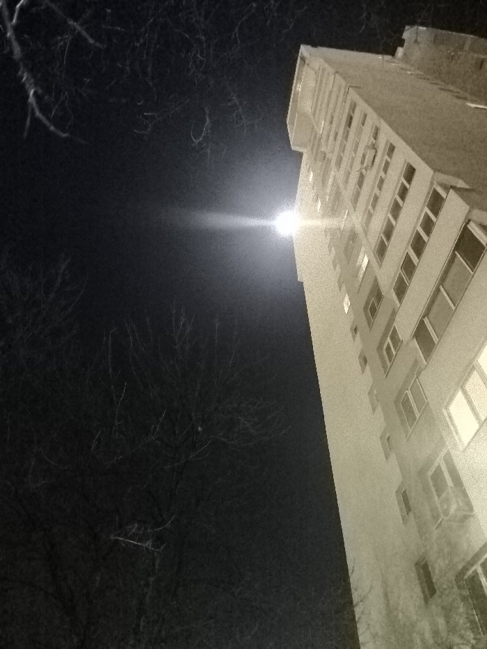 The image depicts an upward-angled nighttime view of a multi-story residential building located in Sofia, Bulgaria. The building, composed of light-colored material, occupies the right two-thirds of the frame, showcasing numerous windows, some of which are illuminated. A prominent, intense light source is centered in the upper-middle of the image, generating a distinct horizontal lens flare that extends across the dark sky. The left portion of the frame features the silhouetted, bare branches of deciduous trees against the dark night sky, indicating a season without foliage. No individuals, specific actions, or interactions are visible within the scene. The environment is consistent with an urban residential area at night.