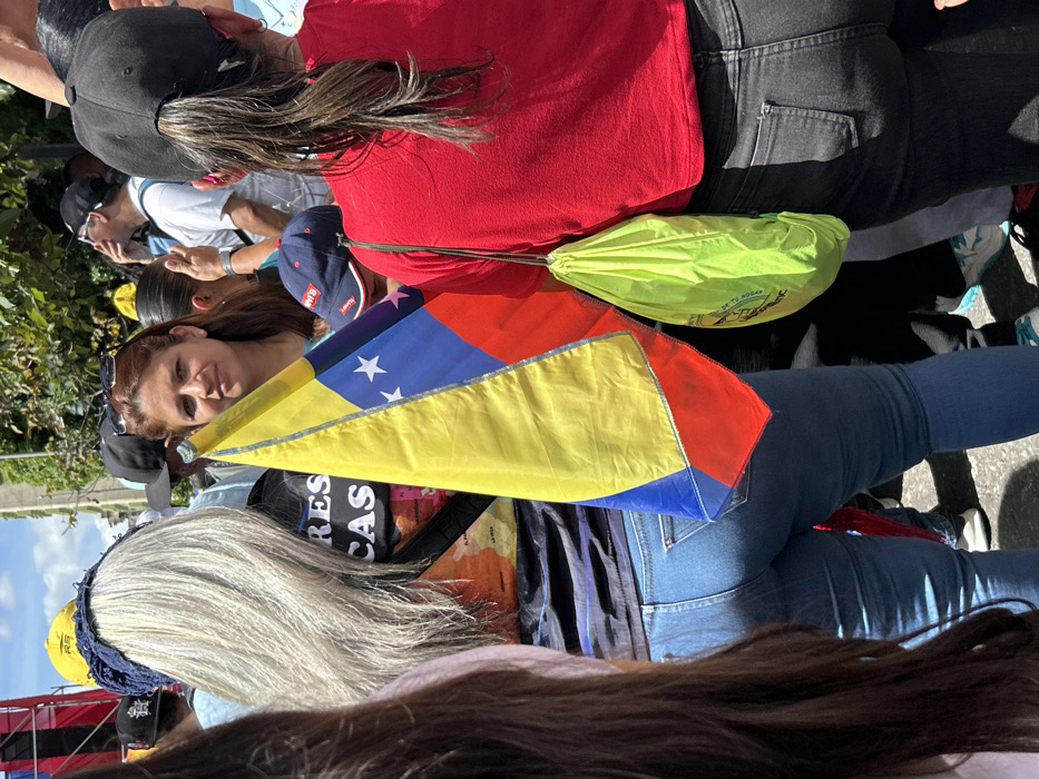 A crowd of people is gathered with a partial view of a woman holding the Venezuelan flag, which features yellow, blue, and red sections with white stars