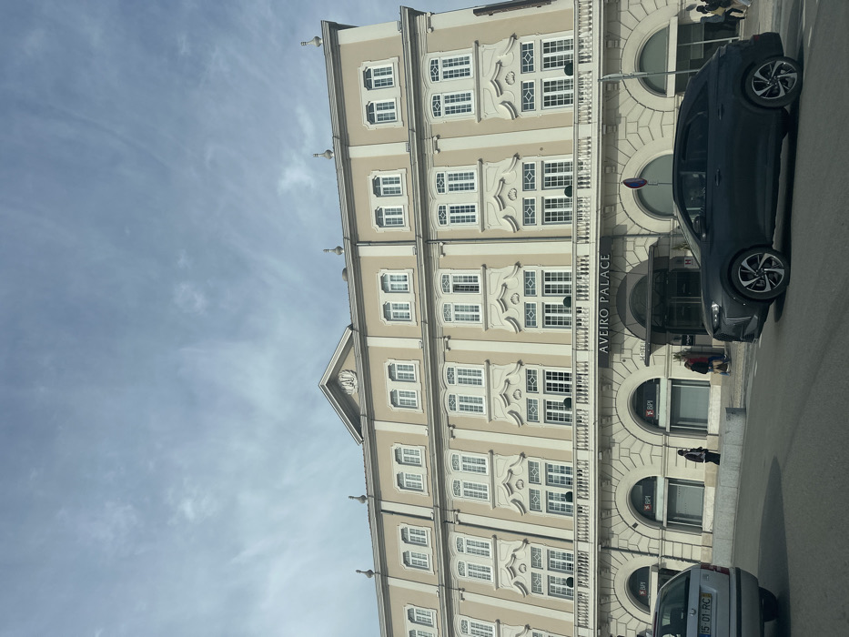 This image displays a street-level view of the Aveiro Palace building in Aveiro, Portugal, under a partially cloudy, light blue sky