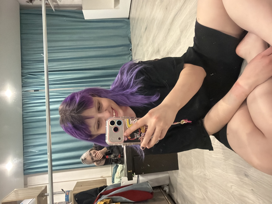 A mirror selfie features a smiling woman with vibrant purple hair and dark bangs