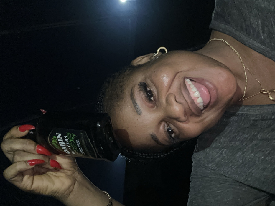 A woman angles her head towards the camera, a wide smile revealing her tongue and white teeth. She wears a gold hoop earring and necklace. A grey t-shirt is visible on her right side. In her left hand, she holds a black bottle labeled "ORIIN Bitters". Her nails are long and painted red. The background is dark, with a light source visible above.