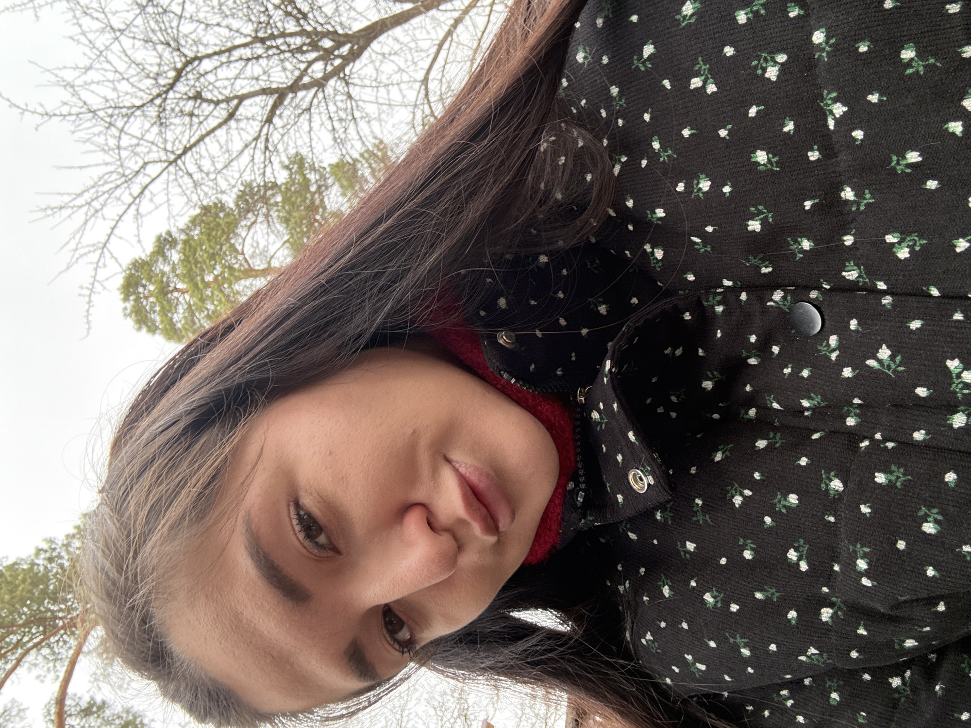 The image displays a close-up, low-angle selfie of a female individual outdoors in Kurovskoye, Russia. The woman has long, dark brown hair and brown eyes, looking directly at the camera with her head slightly tilted and lips subtly pursed. She is wearing a black jacket featuring a repeating pattern of small white flowers with green stems. A red, ribbed high-neck garment is visible beneath the jacket's collar. The jacket's collar has a visible silver snap button. The background consists of an overcast sky, with the upper sections of several trees visible. These include pine trees with green foliage and deciduous trees displaying bare branches, consistent with a cool season.