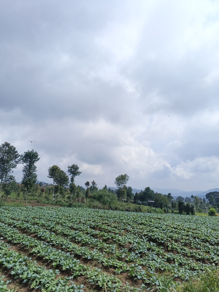 The scene depicts an expansive agricultural field located in Nam Sa Lat, Myanmar. The foreground is dominated by uniformly planted rows of green leafy crops, likely brassicas, set in dark brown soil. In the midground, a diverse line of trees, varying in height and foliage, forms a natural barrier separating the field from the distant terrain. A small, dark-roofed structure is partially visible among the trees in the right-center midground. The background features undulating hills covered with vegetation, appearing somewhat hazy. The upper two-thirds of the image consists of an overcast sky filled with large, grey cumulus clouds. Two birds are present in the sky; one is visible in the upper left quadrant, and a smaller, dark silhouette is in the upper right quadrant. No human activity or individuals are visible.