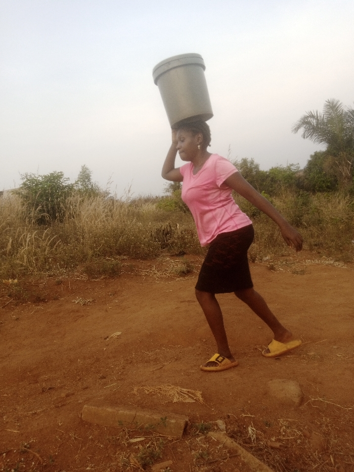 A dark-skinned female, appearing to be in motion, carries a large, light grey plastic bucket balanced on her head