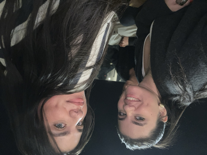 This image depicts three individuals in Be'er-Sheva, Israel, at nighttime. In the immediate foreground, two young adult females are positioned, both looking directly towards the camera. The female on the left has dark hair styled in a high ponytail, light-colored eyes, and is smiling, revealing dimples. She is wearing a dark, textured cardigan over a light-colored V-neck top, a gold-colored necklace, and gold-colored hoop earrings. Her left hand is partially visible, holding a metallic object, possibly a lighter, and displays red nail polish. The female on the right has long, dark hair worn down, light-colored eyes, and a slight smile, also revealing dimples. She is wearing a black and white striped top or sweater and is positioned with her body partially turned away, looking back over her left shoulder. A third individual, partially obscured by the two foreground subjects, is visible in the mid-ground. This individual appears to be seated, wearing a dark top and light-colored pants, and is looking towards the right side of the frame. The background is predominantly dark, indicating a nighttime setting, with a faint reflection of what appears to be a window or glass surface behind the third person. Artificial light illuminates the faces of the foreground subjects.