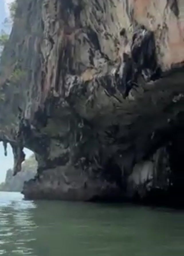 The camera follows a boat approaching the entrance of a cave