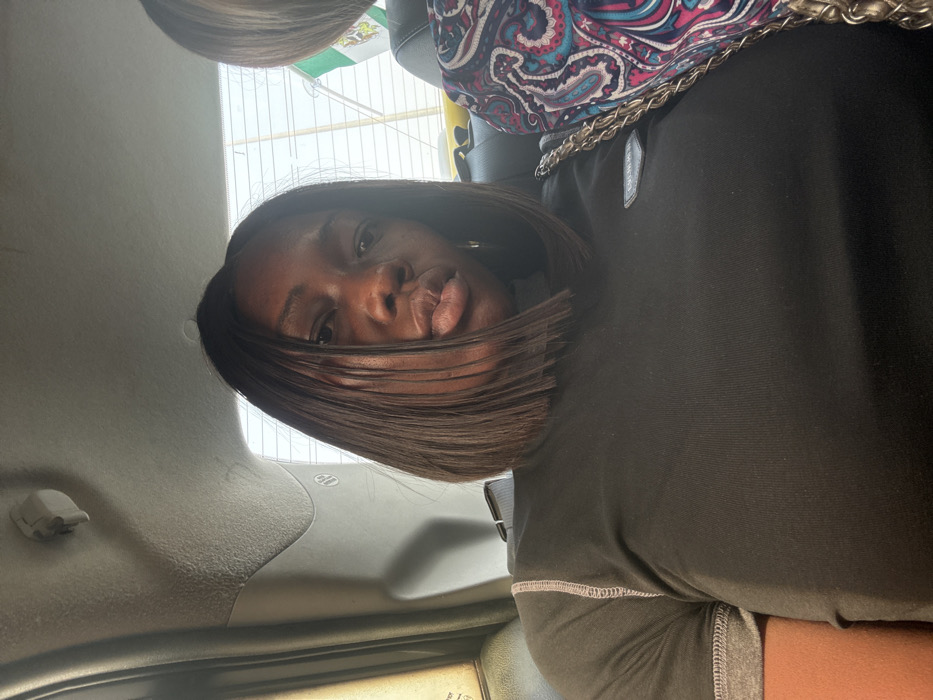 The image depicts two individuals seated inside the rear of a vehicle in Karmajiji, Nigeria. The primary subject, a dark-skinned female, occupies the left side of the frame, facing the camera directly. She has straight, dark, chin-length bobbed hair and wears a dark, possibly olive green or black, short-sleeved top with light-colored stitching detailing on the shoulder seam. A dark, rectangular label is visible on the upper left chest of her shirt. Her lips are slightly pursed. To her right, a second individual is partially visible, showing a shoulder and upper arm covered by a garment with a vibrant, multi-colored paisley pattern featuring pink, blue, and purple hues. A metallic, possibly chain-link, strap of an accessory or bag is also visible near this individual. Through the vehicle's rear window, a blurred outdoor scene is visible, dominated by a light sky, and notably, a green and white Nigerian flag is prominently displayed, confirming the national context. The vehicle's interior headliner and a portion of a ceiling-mounted handle are visible in the upper left.