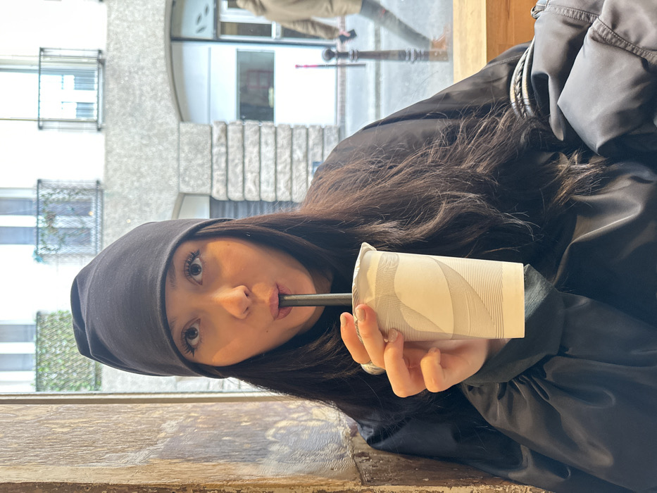 - "A woman in a black beanie and jacket drinks from a white and gray patterned cup with a black straw" by FM-IHyJw1, licensed under CC BY 4.0