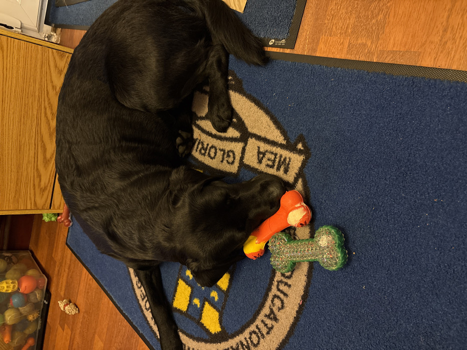 A black Labrador Retriever dog is depicted lying on a blue mat in an indoor setting. The dog is positioned with its head towards the left, resting near two toys: an orange and yellow bone-shaped chew toy, and a transparent green textured bone-shaped chew toy. The dog's eyes appear closed, suggesting it is sleeping or resting. The blue mat features a yellow and tan emblem with partial text visible, including "DUCATIONAL" and "MEA GLORIA," indicative of Oswestry School, placing the scene within Oswestry, United Kingdom. The mat rests on a light brown wooden floor. In the upper left background, a clear plastic storage container filled with various colorful dog toys is visible. A small, light-colored chew toy is present on the wooden floor near the container. Part of a light-colored wooden furniture item or wall panel is visible in the upper right background, beneath which a red bone-shaped toy is partially obscured. No human subjects are present.