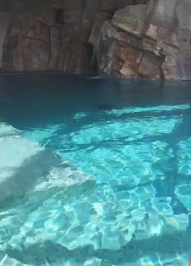 body of water, likely a pool, with clear, turquoise-colored water. The surface of the water is shimmering. In the background is a man-made rock formation with a small waterfall cascading into the water. There is a large marine animal, possibly a manta ray or stingray, swimming underwater. The scene is peaceful and evokes a natural or artificial tropical setting.