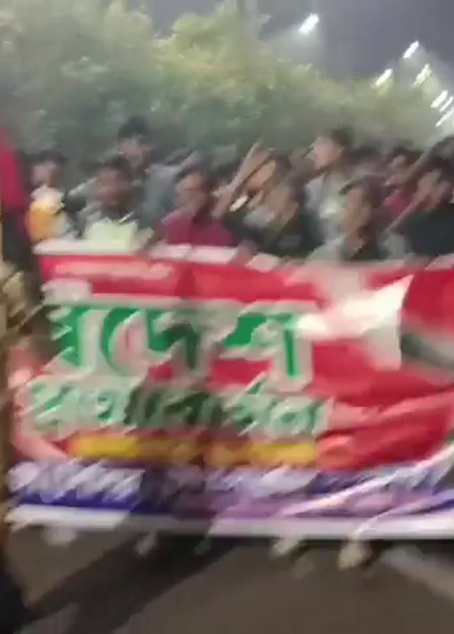 A nighttime video shows a large group of people marching down a brightly lit street, with trees lining the road. The crowd is carrying a long red banner with green and yellow lettering and portraits of two men on either side. A man in a tan outfit walks in front of the banner, raising a small flag. Many people in the crowd are looking at the camera and making hand gestures. The buildings in the background are blurred, suggesting the focus is on the marchers.