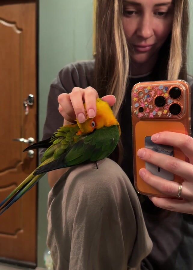 A young woman with long brown hair and blonde highlights is holding her orange iPhone in her right hand to take a selfie. She is wearing a gray t-shirt and her left hand is gently petting the head of a colorful bird perched on her left knee. The bird has a yellow head, green body, and blue tail feathers. A wooden door with a silver knob is visible in the background, along with a partial view of a light-colored wall. The lighting appears to be indoor and artificial.