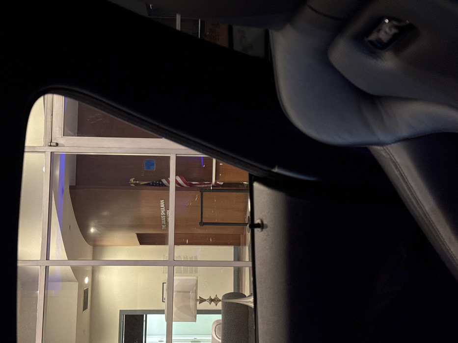 The image depicts an interior view of The Julius Shulman Gallery, located within the Richard J. Riordan Central Library in downtown Los Angeles, California, observed from inside a vehicle at night. The foreground shows the dark interior of the vehicle, including a black door panel, a silver door lock button, and the upper right portion of a gray upholstered car seat. Through the vehicle's window, the brightly lit gallery interior is visible. A prominent wood-paneled wall features an illuminated sign reading "THE JULIUS SHULMAN GALLERY". To the right of this sign, an American flag with a golden eagle finial stands erect, likely on a pole. A black retractable belt stanchion is positioned in the lower center, in front of the flag and sign. To the left, a section of a gray upholstered sofa or bench is visible, alongside a decorative table lamp with a square, light-colored shade and a metallic, geometrically patterned base. The interior space features light-colored wall sections, overhead lighting, and architectural elements including curved walls and ceiling features, visible through large glass panels framed by light-colored mullions. No individuals are present in the scene.