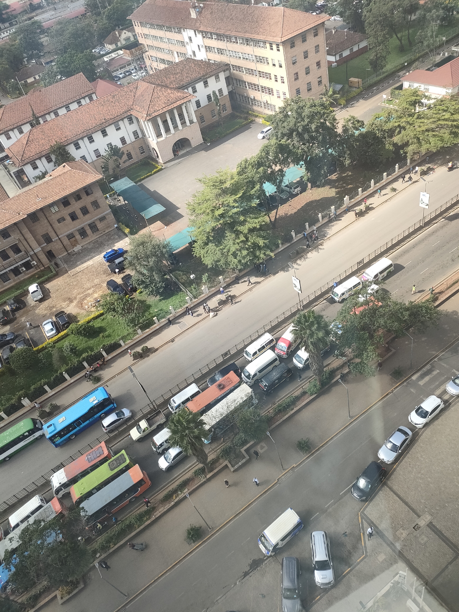 The image depicts an aerial view of a street in Nairobi, Kenya. A busy road runs through the scene, filled with traffic including buses, vans, and cars of various colors. Pedestrians are visible walking along the sidewalks on both sides of the road. A row of buildings with red-tiled roofs is on one side of the street, while a grassy area separates the other side of the street from another building. Numerous parked vehicles and trees are also visible. The overall setting is urban and densely populated.