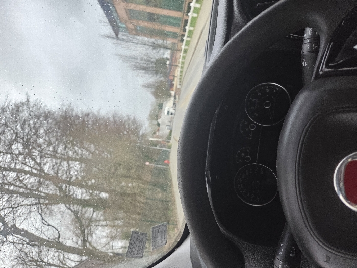 The image displays a forward-facing view from the interior of a vehicle on an overcast day