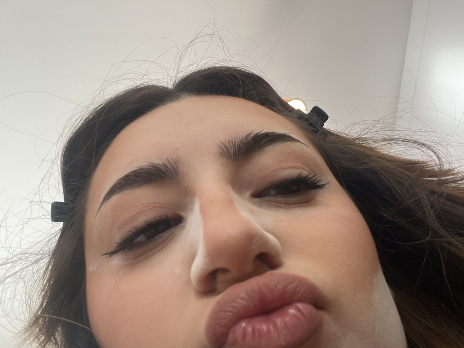 A woman with brown hair and fair skin looks up at the camera, making a kissing face. Her makeup includes defined eyebrows, eyeliner, and nude lipstick. White powder is visible on her face, possibly as part of a makeup routine. Hair clips are placed in her hair on both sides. The background appears to be a plain, light-colored wall or ceiling. The camera angle is a low-angle perspective, giving a close-up view of the woman's face.