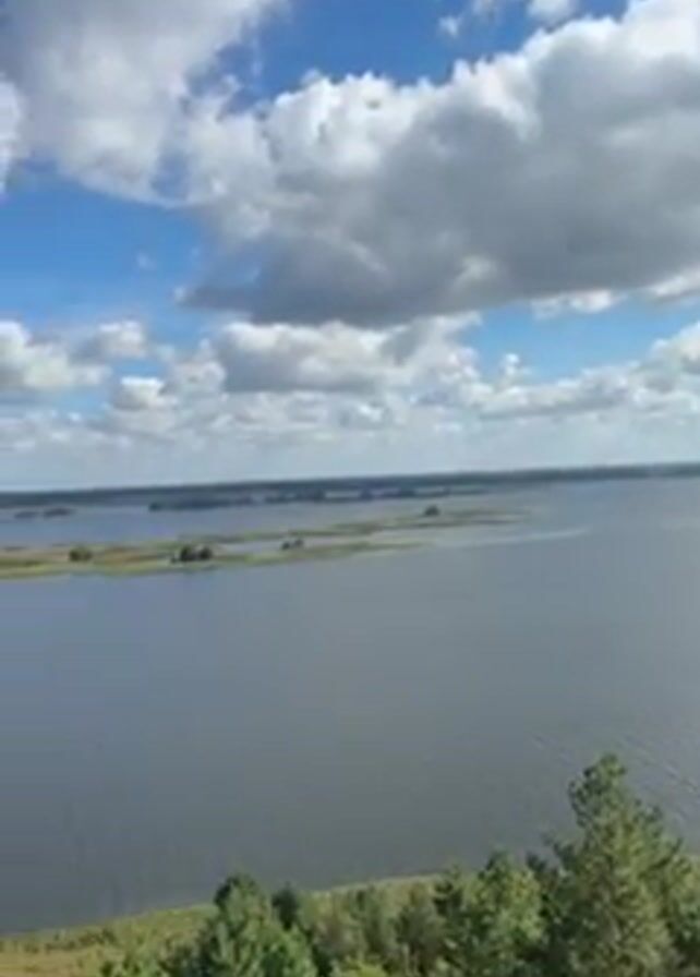 wide view of a large body of water under a partly cloudy blue sky. There are a few small islands visible in the distance. The foreground shows trees and foliage. The camera then shifts to a woman wearing sunglasses and a plaid shirt, taking a selfie with the lake in the background. She touches her hair.