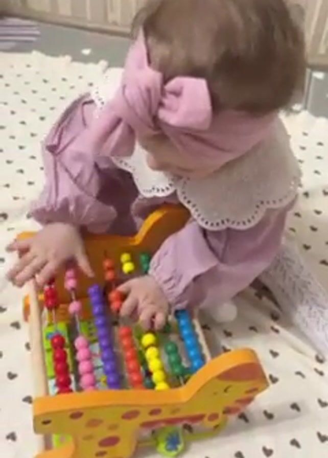 A baby girl wearing a purple dress with a lace collar and a pink headband is sitting on a blanket decorated with tiny hearts. She is playing with a wooden abacus shaped like a giraffe, pushing the colorful beads back and forth. Beside her sits a white stuffed rabbit toy. She momentarily stops playing with the abacus and looks at the rabbit, then looks off-camera. The background appears to be a room with a bed or crib.