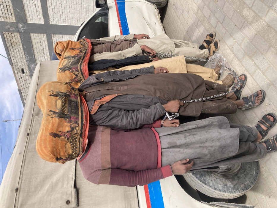 Four adult males are depicted standing in a line on a paved surface in Quetta City Tehsil, Pakistan. Their faces are obscured by a patterned orange-brown textile. All individuals are secured together by metal handcuffs and chains. The leftmost individual wears a maroon, pink, and light brown horizontally striped sweater, grey shalwar, and black sandals. His left wrist is cuffed to the right wrist of the adjacent individual. The second individual from the left wears a dark grey jacket over a brown long-sleeve garment, brown shalwar, and dark sandals. His left wrist is cuffed to a metal chain that extends towards the third individual. The third individual, wearing a light beige traditional outfit and dark closed-toe shoes, appears to have his wrists connected by chains to the second and fourth individuals. The rightmost individual wears a light brown traditional outfit, a dark vest, and light brown sandals; his right wrist appears connected by a chain to the third individual. Behind the individuals, a white vehicle with a blue and red stripe (likely an official vehicle) is partially visible on the right, and a light-colored canvas-covered vehicle is partially visible on the left. The background features sections of light-colored brick walls under a partly cloudy sky. The ground is a light-colored paved surface with visible grout lines. The scene is illuminated by natural daylight.
