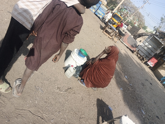 The image depicts an unpaved street scene in Gobirawa, Nigeria, under bright daylight. In the immediate foreground, two individuals are standing on dry, dusty ground, casting prominent shadows. One person on the left is partially visible, wearing a light-colored striped shirt, dark pants, and light-green sandals. Adjacent to them, another individual stands, seen from the back, wearing a long-sleeved brown garment and light-colored flip-flops. To the right and slightly forward of the standing figures, a third individual is seated directly on the ground. This person is draped in a reddish-brown garment or hijab, with their right hand raised, covering their face. Next to the seated individual are a white bucket with a blue and green lid and a small, translucent white plastic container. The background shows an unpaved road extending into the distance, bordered by various objects and structures. A yellow motorized tricycle (Keke Napep) is visible on the road, alongside several blue-colored vehicles. Scattered wooden structures, possibly market stalls or discarded items, are present. A reddish-patterned rug or mattress lies on the ground to the right. Utility poles with overhead wires and sparse trees are visible against a clear sky.
