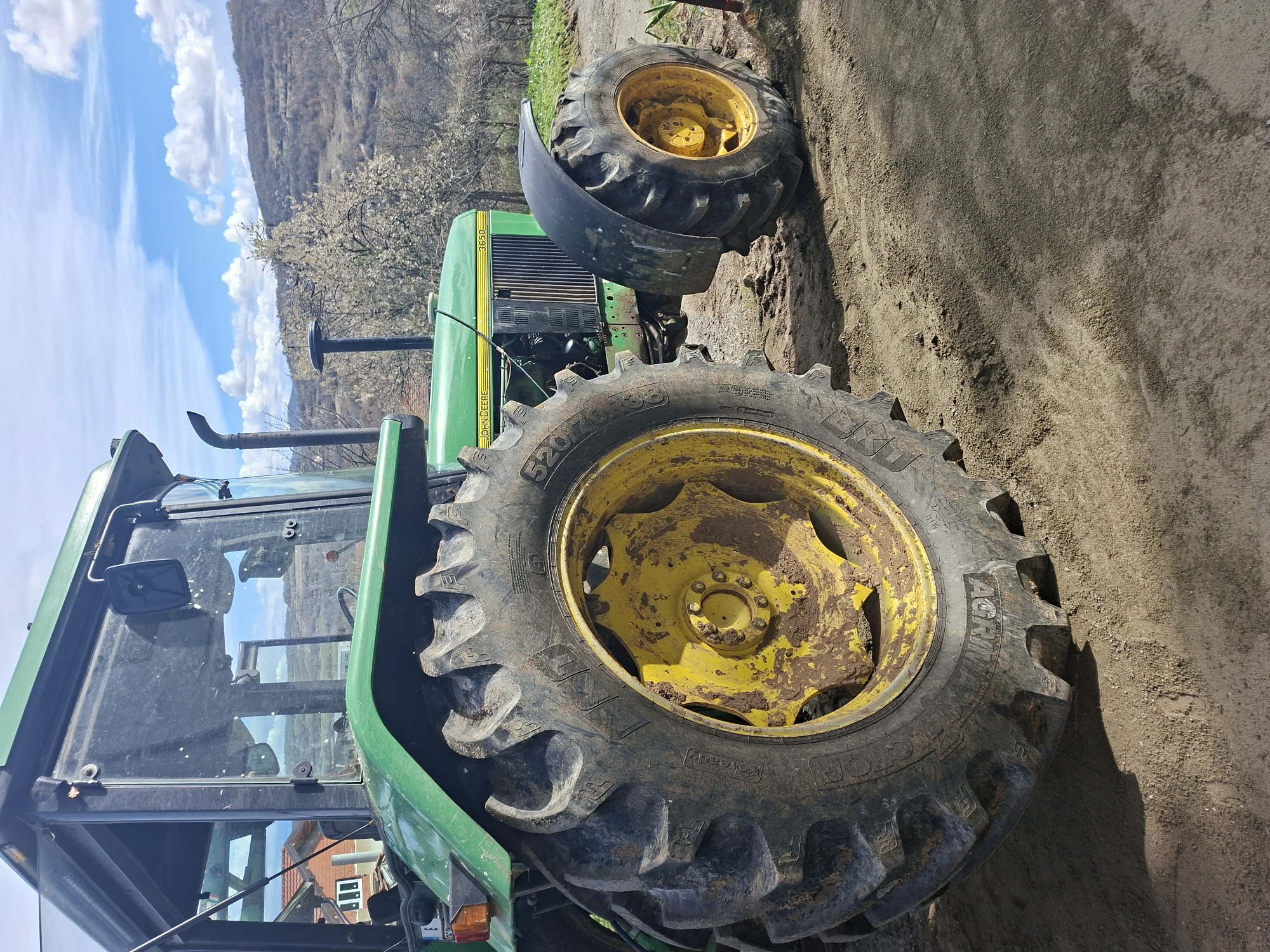 A green John Deere 3650 tractor is parked on a dirt surface in Selishte, Bulgaria. The tractor has large, heavily treaded tires with yellow rims, some of which are mud-splattered. The cab is visible, with reflections in the glass. The background features a hillside with sparse trees under a blue sky with scattered clouds. Part of a building with a red roof is visible in the lower left corner of the image, reflected in the cab's glass.